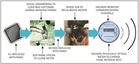 即使掛網的電表都具備一定的保護措施,可在一定程度上防止篡改。我們仍然能夠發(fā)現一些容易遭受攻擊的環(huán)節(jié)——生產環(huán)節(jié),所謂的“社交工程”為攻擊者侵入IP和生產流程提供了機會。花費數千美金,攻擊者就有可能獲取程序,通過逆向工程修改后,將“新程序”植入產品。另外,攻擊者也可以將你的程序出售給競爭對手,造成巨大損失。