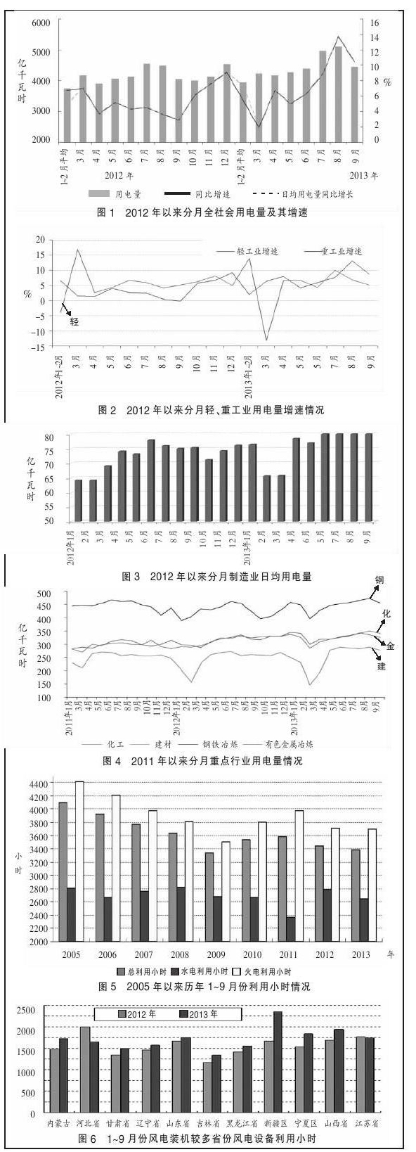 1~9月份,全國電力供需總體平衡。全國用電市場延續(xù)2012年以來中速增長態(tài)勢,9月份全社會用電量高速增長。上半年水電多發(fā)、火電發(fā)電量低速增長,但7月份以來全國水電發(fā)電量連續(xù)三個(gè)月同比負(fù)增長,大部分水電大省水電發(fā)電量負(fù)增長,為火力發(fā)電留出了市場空間,9月份全國火電發(fā)電量增速仍然超過10%;水電、火電、核電設(shè)備累計(jì)利用小時(shí)均比上年同期回落,風(fēng)電發(fā)電量快速增長、設(shè)備利用小時(shí)同比明顯增加。